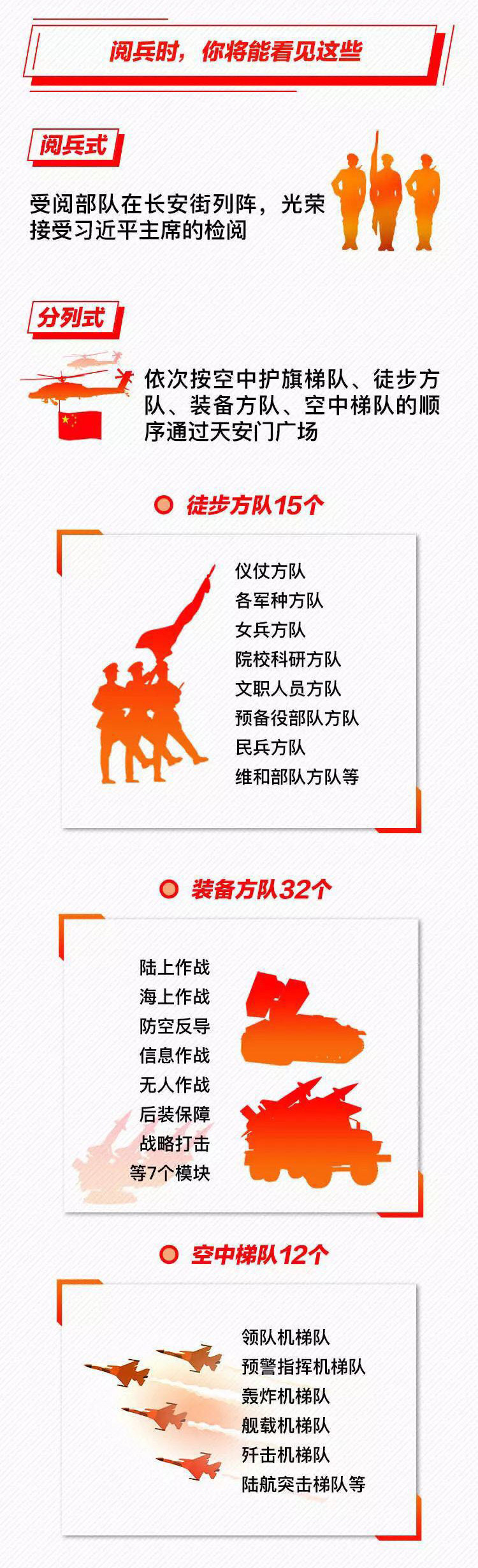 為慶祝新中國成立70周年,10月1日北京天安門廣場將舉行盛大閱兵式。屆時,32個裝備方隊、12個空中梯隊將通過天安門廣場,接受檢閱。此次閱兵,所有受閱裝備均為國產現役主戰裝備,其中包括我軍部分新型裝備,是近幾次閱兵中規模最大的一次。