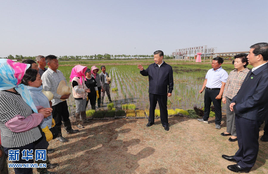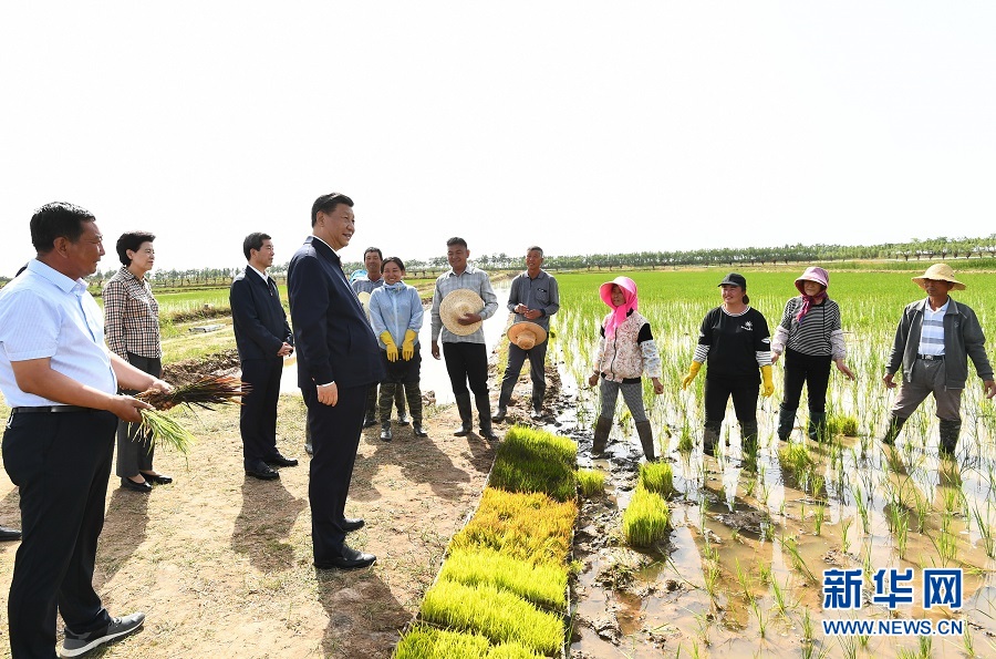 6月8日至10日,中共中央總書記、國家主席、中央軍委主席習近平在寧夏考察。這是6月9日下午,習近平在銀川市賀蘭縣稻漁空間鄉村生態觀光園,同正在勞作的村民親切交談。 新華社記者 鞠鵬 攝