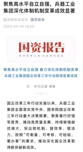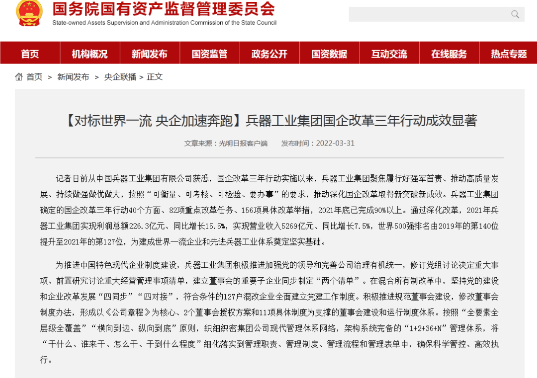 國資委網站:【對標世界一流 央企加速奔跑】兵器工業集團國企改革三年行動成效顯著