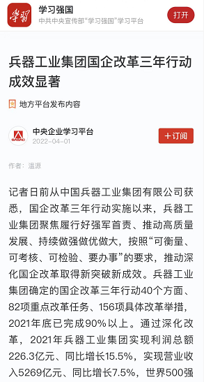 學習強國平臺:兵器工業集團國企改革三年行動成效顯著