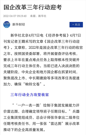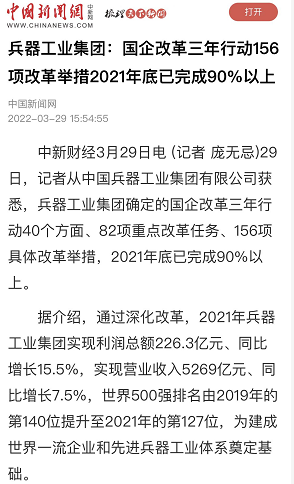 中國新聞社:兵器工業集團:國企改革三年行動156項改革舉措2021年底已完成90%以上
