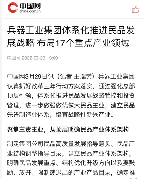 中國網:兵器工業集團體系化推進民品發展戰略 布局17個重點產業領域