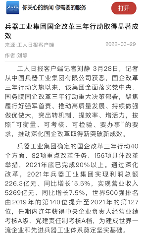 工人日報客戶端:兵器工業集團國企改革三年行動取得顯著成效