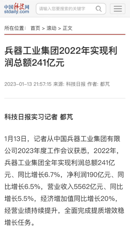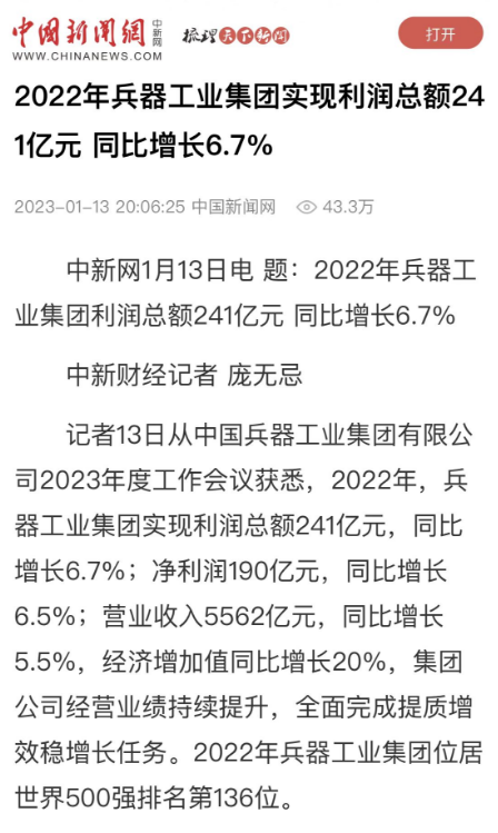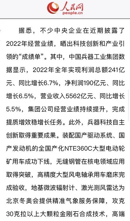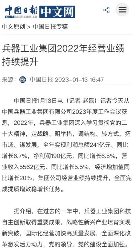 1月13日,中國(guó)兵器工業(yè)集團(tuán)有限公司召開2023年度工作會(huì)議,傳達(dá)學(xué)習(xí)中央領(lǐng)導(dǎo)同志、軍方首長(zhǎng)和上級(jí)部門重要批示,總結(jié)集團(tuán)公司2022年工作,研究部署2023年主要工作任務(wù)。 集團(tuán)公司2022年重點(diǎn)工作取得的成績(jī)及下一步的改革發(fā)展受到社會(huì)媒體廣泛關(guān)注。新華社、新華財(cái)經(jīng)、人民網(wǎng)、經(jīng)濟(jì)日?qǐng)?bào)客戶端、光明日?qǐng)?bào)客戶端、中國(guó)日?qǐng)?bào)網(wǎng)、中國(guó)科技網(wǎng)、中國(guó)新聞網(wǎng)、央廣網(wǎng)、國(guó)資委網(wǎng)站、學(xué)習(xí)強(qiáng)國(guó)中央企業(yè)學(xué)習(xí)平臺(tái)、新浪網(wǎng)、騰訊網(wǎng)、搜狐網(wǎng)、網(wǎng)易網(wǎng)、今日頭條等中央主流媒體、國(guó)家部委網(wǎng)站及知名網(wǎng)絡(luò)媒體對(duì)集團(tuán)公司工作會(huì)議進(jìn)行了報(bào)道,重點(diǎn)關(guān)注集團(tuán)公司高質(zhì)量發(fā)展、科技創(chuàng)新、戰(zhàn)略性新興產(chǎn)業(yè)培育、深化改革、國(guó)際化經(jīng)營(yíng)、履行央企社會(huì)責(zé)任等內(nèi)容。其中新華社以《北斗時(shí)空智能服務(wù)平臺(tái)累計(jì)服務(wù)終端數(shù)突破15億》為題,重點(diǎn)報(bào)道了集團(tuán)公司2022年在自主創(chuàng)新、戰(zhàn)略新興產(chǎn)業(yè)培育、專利申請(qǐng)等方面取得的成績(jī);經(jīng)濟(jì)日?qǐng)?bào)客戶端、光明日?qǐng)?bào)客戶端、中國(guó)日?qǐng)?bào)網(wǎng)等以《兵器工業(yè)集團(tuán)2022年經(jīng)營(yíng)業(yè)績(jī)持續(xù)提升》為題,重點(diǎn)報(bào)道了集團(tuán)公司在高質(zhì)量發(fā)展、全面完成提質(zhì)增效穩(wěn)增長(zhǎng)方面取得的成績(jī)。集團(tuán)公司門戶網(wǎng)站、微信公眾號(hào)、微博等新媒體也對(duì)集團(tuán)公司工作會(huì)議進(jìn)行了及時(shí)報(bào)道,各成員單位紛紛對(duì)相關(guān)內(nèi)容進(jìn)行轉(zhuǎn)載,引發(fā)全系統(tǒng)關(guān)注。 新華社:北斗時(shí)空智能服務(wù)平臺(tái)累計(jì)服務(wù)終端數(shù)突破15億 新華財(cái)經(jīng):兵器工業(yè)集團(tuán)2022年實(shí)現(xiàn)凈利潤(rùn)190億元 同比增長(zhǎng)6.5% 人民網(wǎng):2022年中央企業(yè)營(yíng)收同比增長(zhǎng)8.3% 科技創(chuàng)新成效顯著 經(jīng)濟(jì)日?qǐng)?bào)客戶端:兵器工業(yè)集團(tuán)2022年經(jīng)營(yíng)業(yè)績(jī)持續(xù)提升 光明日?qǐng)?bào)客戶端:兵器工業(yè)集團(tuán)2022年經(jīng)營(yíng)業(yè)績(jī)持續(xù)提升 中國(guó)日?qǐng)?bào)網(wǎng):兵器工業(yè)集團(tuán)2022年經(jīng)營(yíng)業(yè)績(jī)持續(xù)提升 中國(guó)科技網(wǎng):兵器工業(yè)集團(tuán)2022年實(shí)現(xiàn)利潤(rùn)總額241億元 中國(guó)新聞網(wǎng):2022年兵器工業(yè)集團(tuán)實(shí)現(xiàn)利潤(rùn)總額241億元 同比增長(zhǎng)6.7% 國(guó)資委網(wǎng)站:2022年兵器工業(yè)集團(tuán)實(shí)現(xiàn)利潤(rùn)總額241億元 同比增長(zhǎng)6.7% 學(xué)習(xí)強(qiáng)國(guó)中央企業(yè)學(xué)習(xí)平臺(tái):兵器工業(yè)集團(tuán)2022年經(jīng)營(yíng)業(yè)績(jī)持續(xù)提升 集團(tuán)公司職工及廣大網(wǎng)友熱議工作會(huì)議 “這次會(huì)議全面總結(jié)了2022年工作,深入分析研判當(dāng)前形勢(shì),部署2023年重點(diǎn)工作,為我們做好2023年及今后一個(gè)時(shí)期的工作明確了目標(biāo)、堅(jiān)定了信心。” “作為兵工人,我要苦練內(nèi)功、不懼挑戰(zhàn)、奮勇向前,為建設(shè)具有全球競(jìng)爭(zhēng)力的世界一流集團(tuán)公司貢獻(xiàn)自己的力量。” “聚焦高科技領(lǐng)域,制造更多的大國(guó)重器,讓更多的產(chǎn)品服務(wù)老百姓。” “在不平凡的2022年取得了亮眼的工作成績(jī),為兵器工業(yè)點(diǎn)贊。” “希望能有更多新型武器裝備部隊(duì),2023年,望你們?cè)賱?chuàng)輝煌,加油!” |