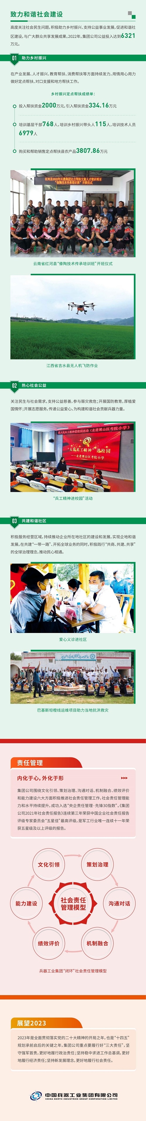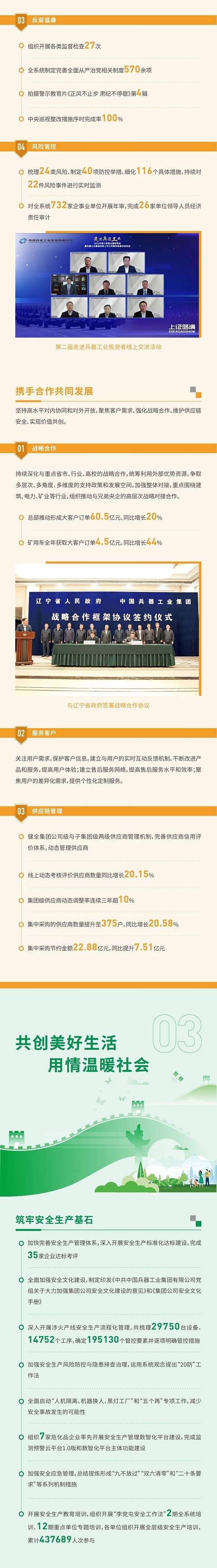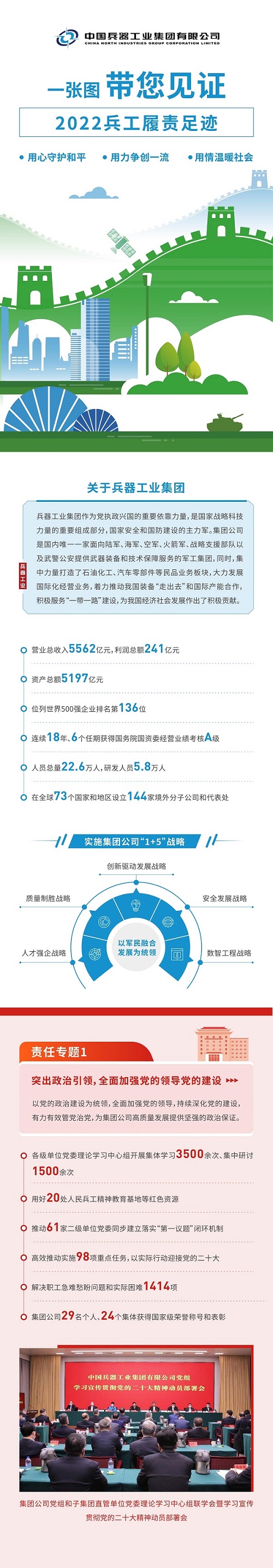 《報告》開篇設置“突出政治引領,全面加強黨的領導黨的建設”“沙場‘秋’點兵,中國兵器閃耀亮相珠海航展”兩個責任專題,聚焦集團公司加強黨建、強軍報國的擔當作為,書寫集團公司在新時代新征程上的奮進答卷。主體章節以“用心守護和平、用力爭創一流、用情溫暖社會”為主題,從恪守強軍首責、服務經濟建設、共創美好生活三個維度展現了集團公司立足“1+5”戰略和“雙十”規劃,聚焦新時代新征程新任務高質量履行政治責任、經濟責任和社會責任的具體行動和成效亮點,詮釋了集團公司服務國家戰略、服務國防和軍隊現代化建設、服務國家經濟社會發展的職責使命。