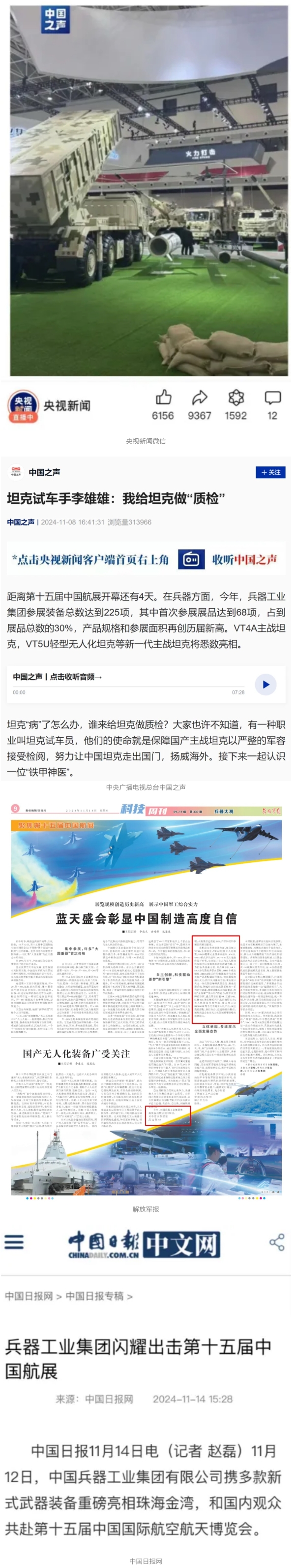 11月12日至17日,第十五屆中國國際航空航天博覽會在廣東省珠海市舉行,中國兵器工業集團有限公司突出數智賦能軍貿合成旅作戰體系,帶來了一系列新產品、新技術、新體系,全方位展示我國陸軍外貿武器裝備發展最高水平、最新突破、最前沿成果,立體化呈現陸域信息化、智能化、體系化作戰能力,受到了全社會廣泛關注。航展期間,央視綜合頻道《新聞聯播》、央視新聞頻道《新聞直播間》《長空鵬程》報道兵器工業集團參展情況,重點介紹了VT4A1主戰坦克、輪式裝甲火炮、新一代陸域指控信息系統、無人戰車、民用無人運輸機及地面裝備演示有關內容。央視新聞推出航展直播節目《藍天之約》,邀請兵器工業集團嘉賓對參展情況、裝備動態演示作了講解。